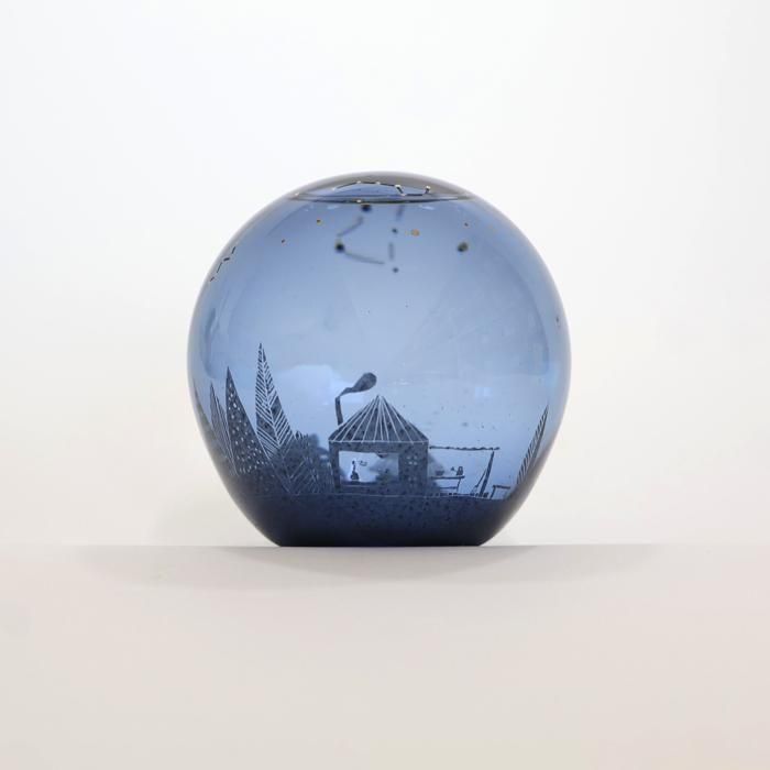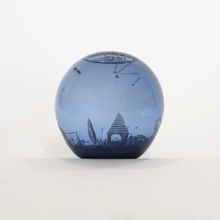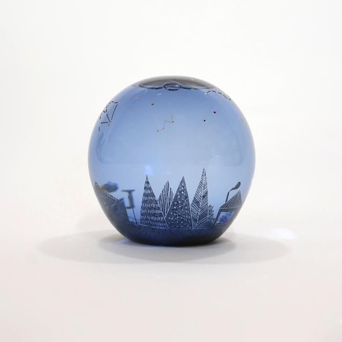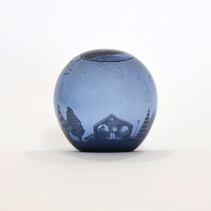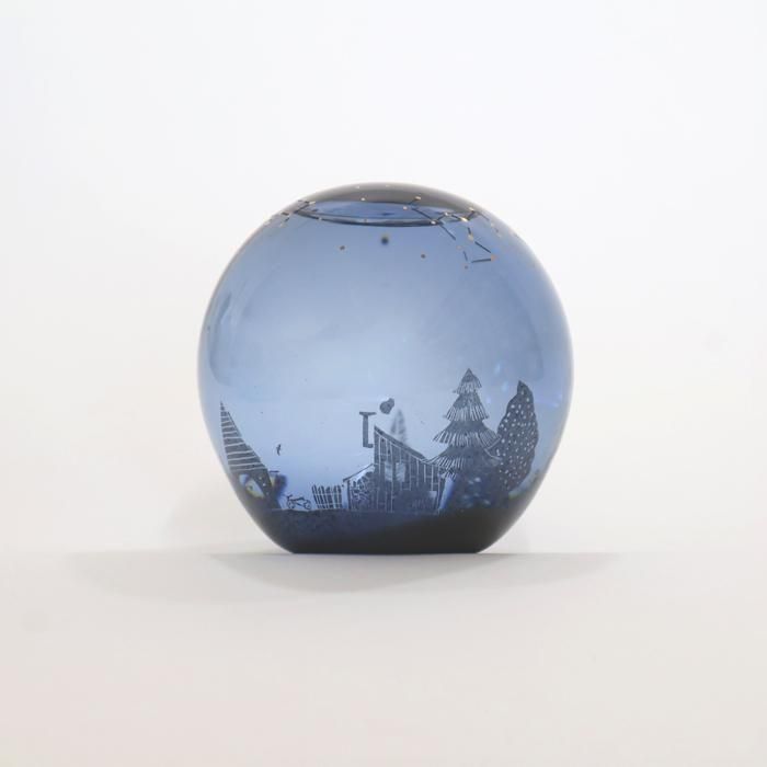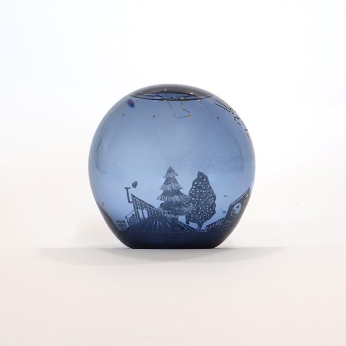 富山ガラス造形研究所を経て、現在も富山の工房にガラス器を製作されています金津沙矢香さんの深いネイビーが色付けられた吹きガラスにフロスト加工のマットネイビーで模様付けされ、ゴールドのメタリックのスノーパウダーやラメがキラキラと舞い落ちる秋のスノードーム/冬の星座/456です。