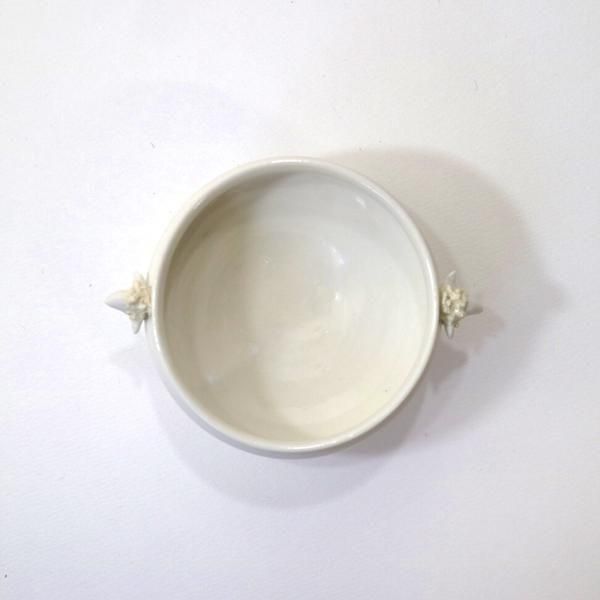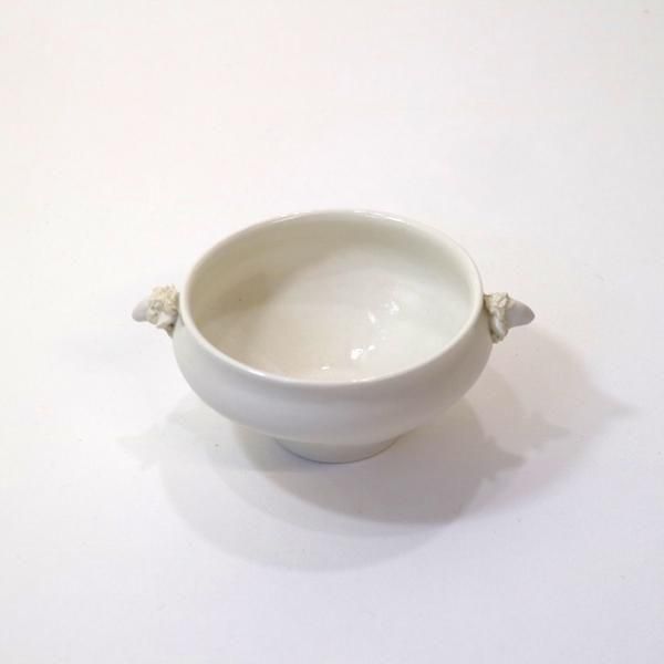 ひつじのスープボウルは中村かおりさんの拘りの「白」の生地を外側はさらさら、内側はつるつるして、外両側に耳(ハンドル)の代わりに羊さんを付けてあります。