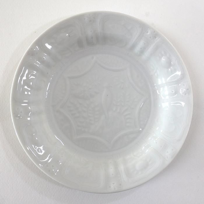 沖縄県読谷村の山田真萬さんの工房に勤務の後、多治見市陶磁器意匠研究所を修了、現在、岐阜県土岐市に工房を構える村上雄一さんの見込み、縁の陰陽の文様が素晴らしい白磁陰陽芙蓉手皿/Aです。