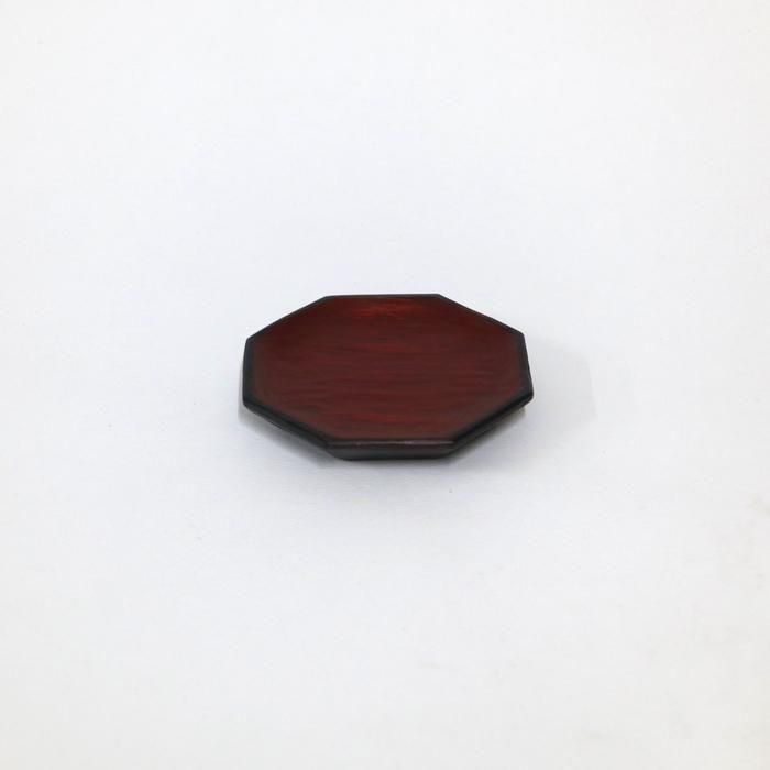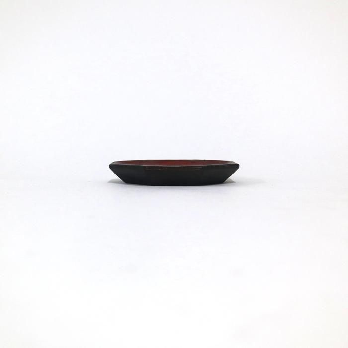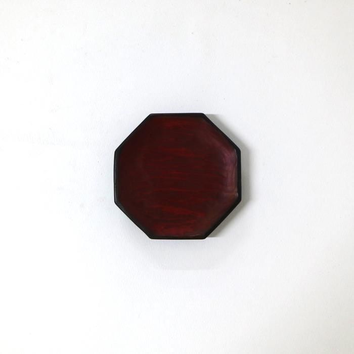赤黒漆八角皿は、表面は赤、裏面は黒の色粉を咥えた拭き漆で生漆を木地に塗り、専用の拭き取り紙で余分な漆を拭き取る作業を繰り返し美しい艶となっています。