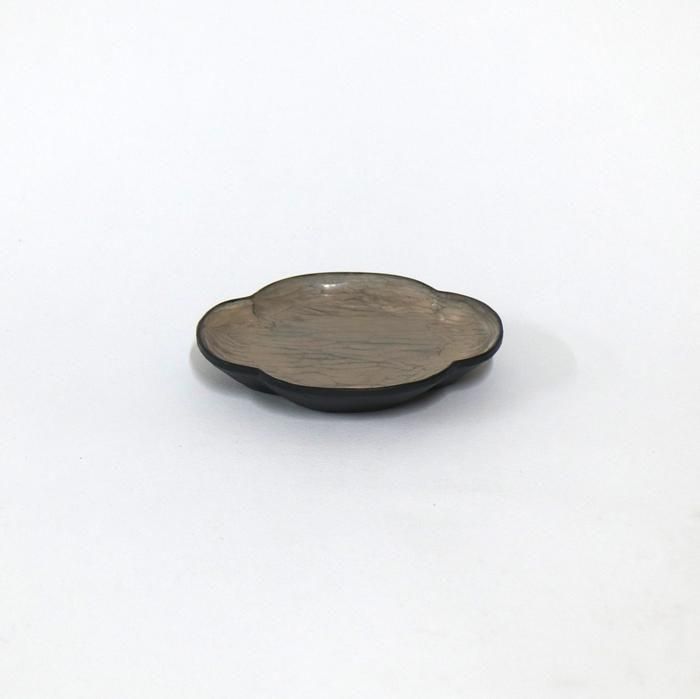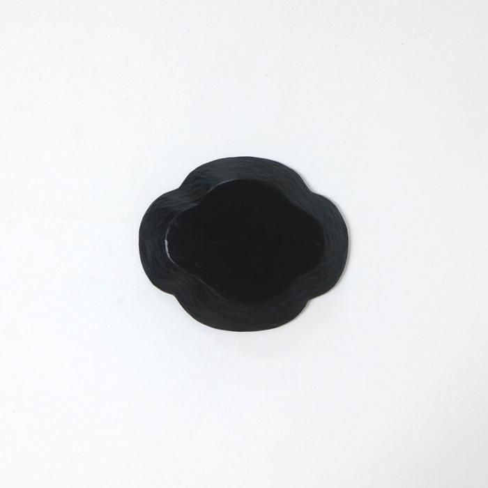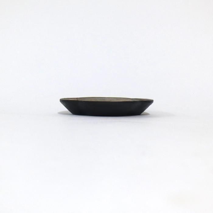 白漆木瓜皿は、表面の見込みに白漆と裏面に黒の色粉を咥えた拭き漆で生漆を木地に塗り、専用の拭き取り紙で余分な漆を拭き取る作業を繰り返し美しい艶となっています。