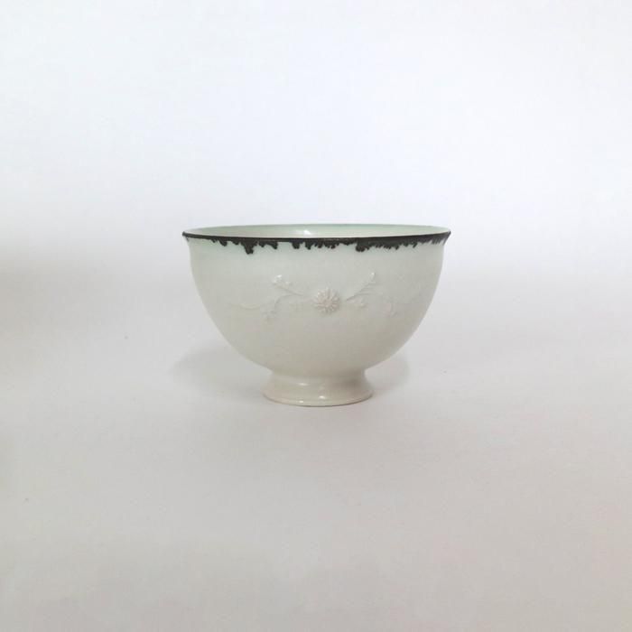 ボウルはr轆轤でラウンドシルエットに成形し、口を鉄で拭き、表面の一箇所にイッチンで横長に野の花のような植物文様が施されています。