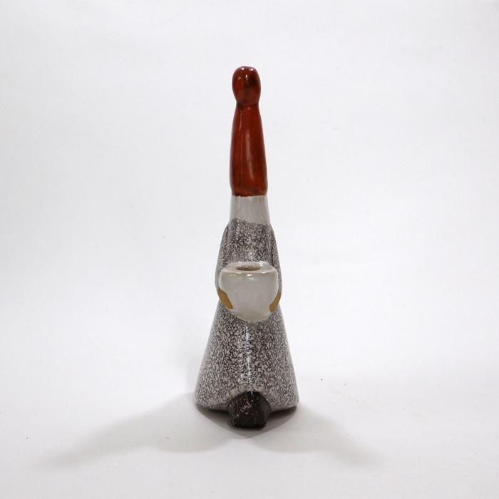 後ろに抱えた手は穴が開いているキャンドルホルダーを抱えています。