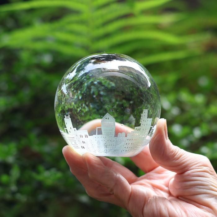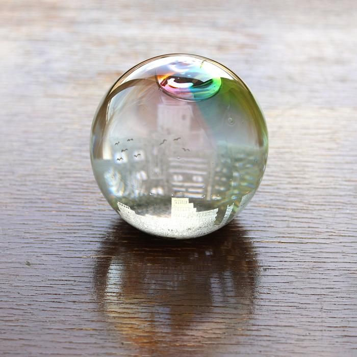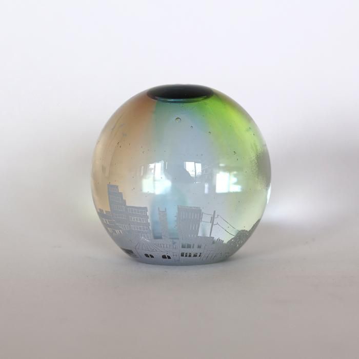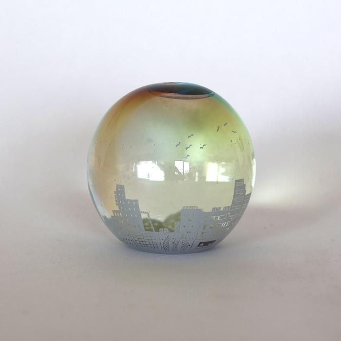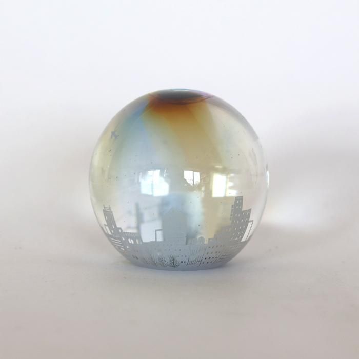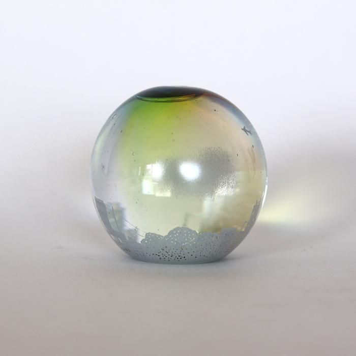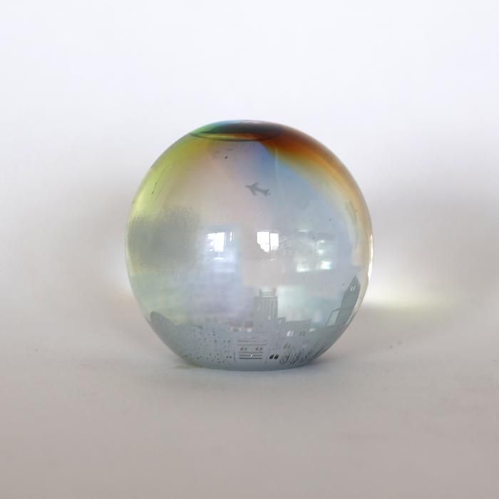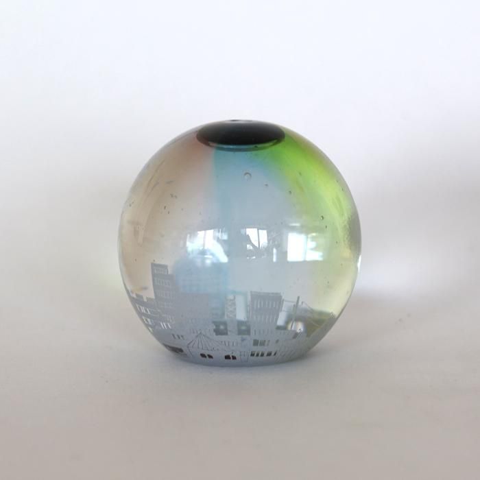 富山ガラス造形研究所を経て、現在も富山の工房にガラス器を製作されています金津沙矢香さんの爽やかな夏のスノードーム/シャボン玉の街/365は、レインボーカラーに染めたラウンド型シルエットのスノードームに淡いグレーのフロスト加工で都会のビルの色々なシルエットだけでなく、形も大きさも異なる様々な窓、その中のインテリアなどに加え、ビルからビルへの送電線などやその狭間にある木々、空高く飛ぶ飛行機、鳥たち、ぽっかり浮かんだ大きな雲などの夏を迎えた都会の風景が絵付けされています。
