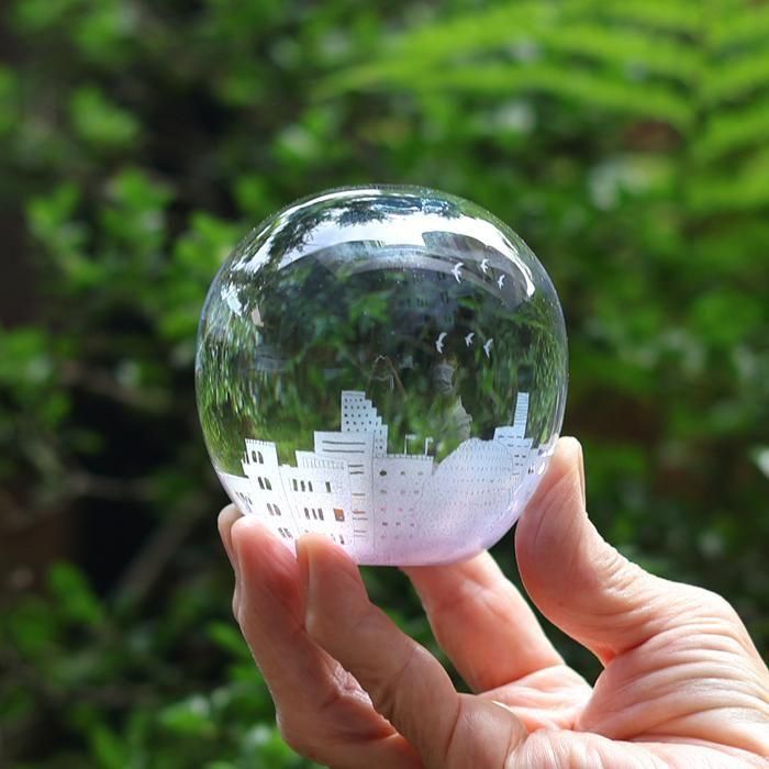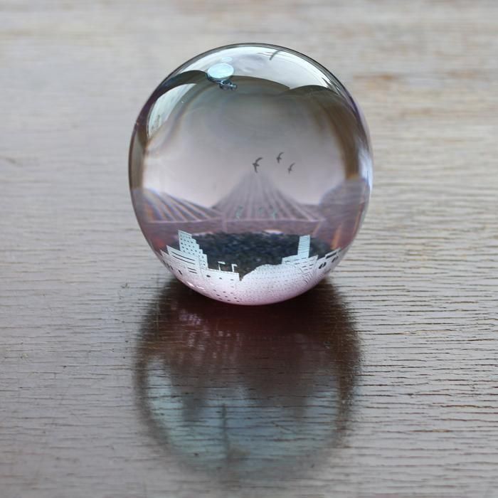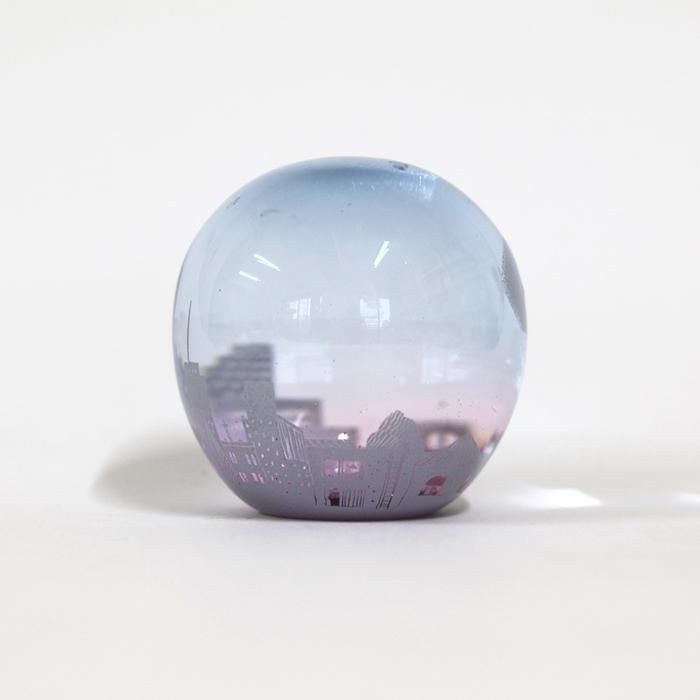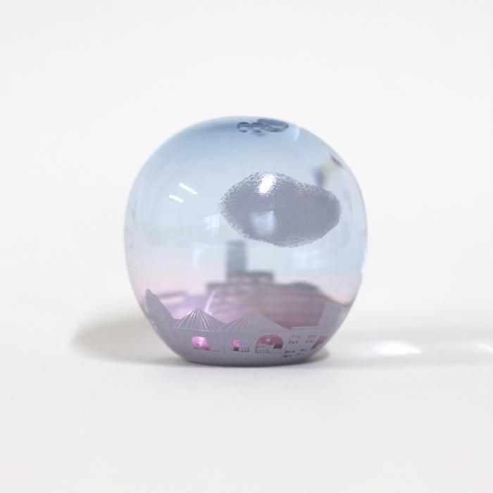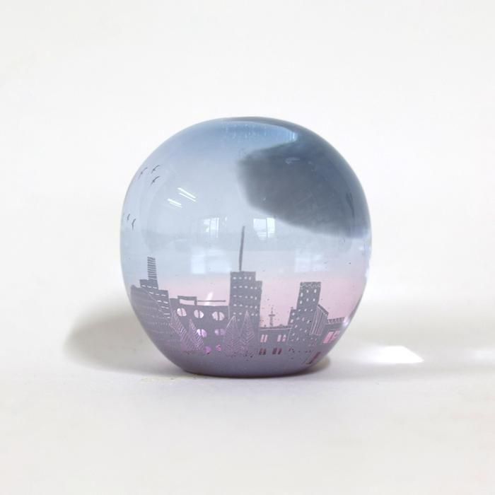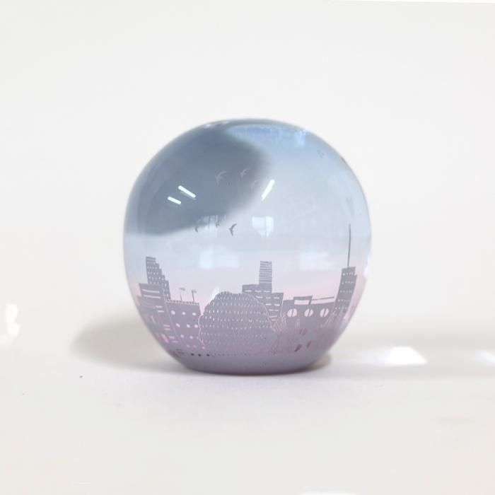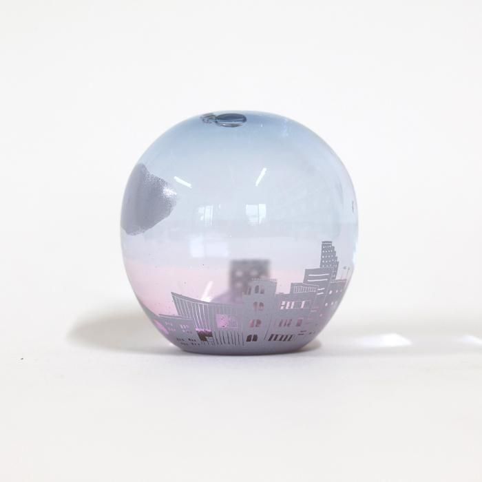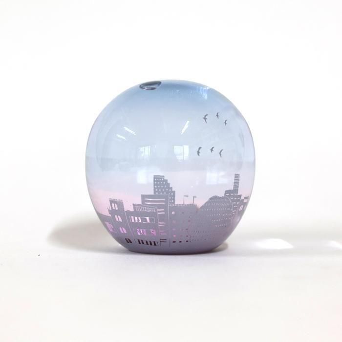 富山ガラス造形研究所を経て、現在も富山の工房にガラス器を製作されています金津沙矢香さんの爽やかな夏のスノードーム/夏の夕暮れ/366は、ブルーピンクグラデーションに染めたラウンド型シルエットのスノードームに淡いパープルのフロスト加工でしもた屋、中低層ビルの色々なシルエットだけでなく、形も大きさも異なる様々な窓、その中のインテリアなどに加え、街路樹、空高く飛ぶ鳥たち、ぽっかり浮かんだ大きな雲などの夏を迎えた地方都市の風景が絵付けされています。