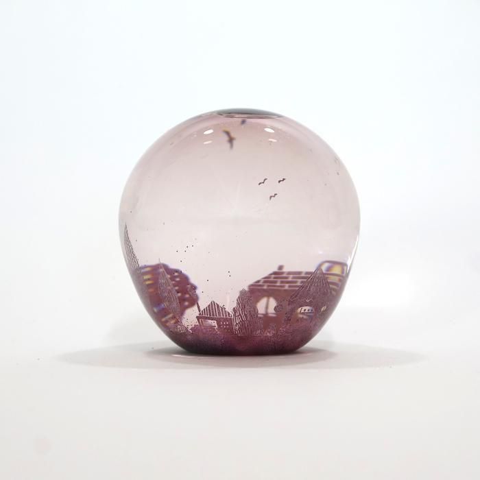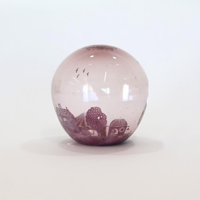 富山ガラス造形研究所を経て、現在も富山の工房にガラス器を製作されています金津沙矢香さんの深い緑色が色付けられた吹きガラスにフロスト加工のマットグリーンで模様付けされ、ゴールドとシルバーがミックスされたメタリックのスノーパウダーやラメがキラキラと舞い落ちる様が爽やかなスノードームから秋のスノードーム/ボルドーの村/454です。