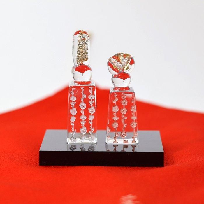 富山ガラス造形研究所を経て、現在も富山の工房にガラス器を制作されています金津沙矢香さんの親王飾りのまめ雛さま/桃です。
