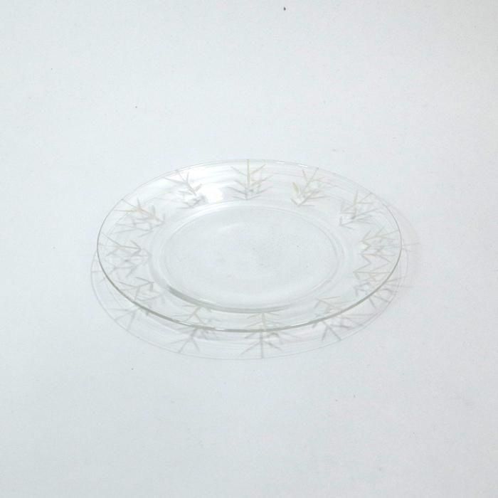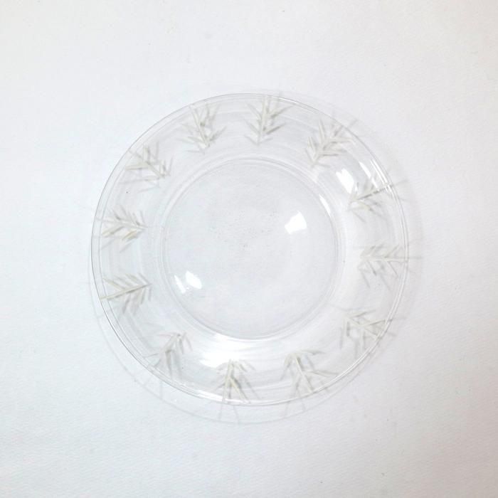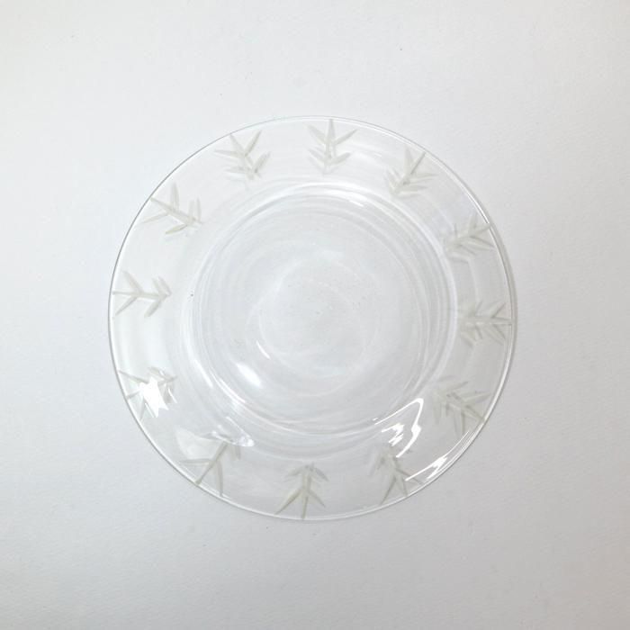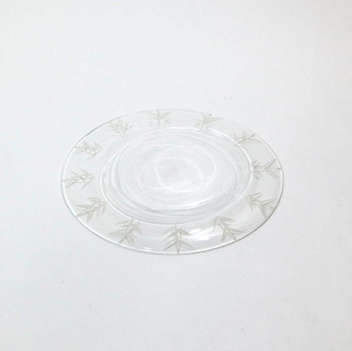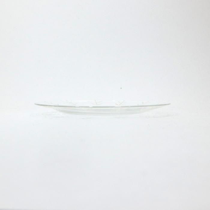 リム皿/Nostalgia/リーフは、6寸皿弱の大きさでリムに放射線上にリーフ文様が絵付けされた気泡が入ったクリアガラスとなっています。