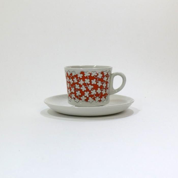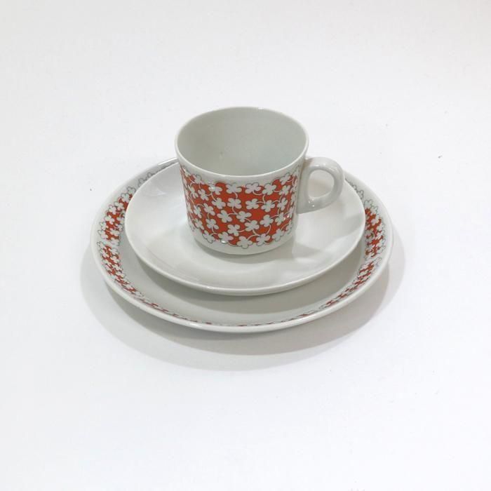 オレンジのベースに白い小花がかわいいフィンランド/アラビア社のPizzicato(ピッツィカート)シリーズのカップ&ソーサーとプレートです。