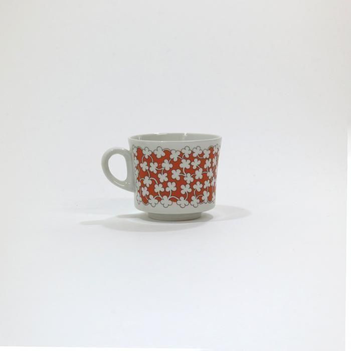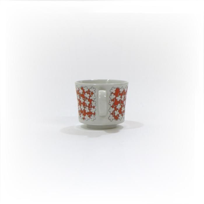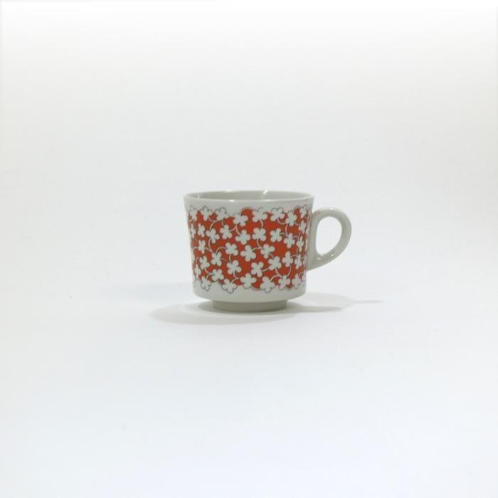 ソーサーは白の無地ですが、カップには鮮やかなオレンジの素地に白い小花のデコレーションが全面に描かれています。