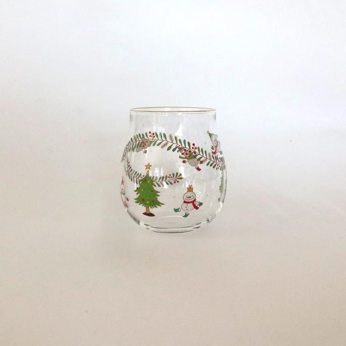 透明度の高いマウスブローガラスで成形したグラスにガラス用絵の具(エナメル)でキュートないろいろなポーズのスノーマンとツリーが絵付けされています。