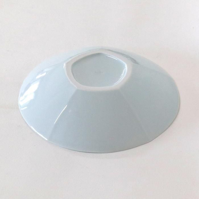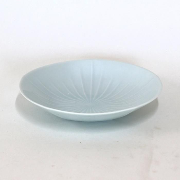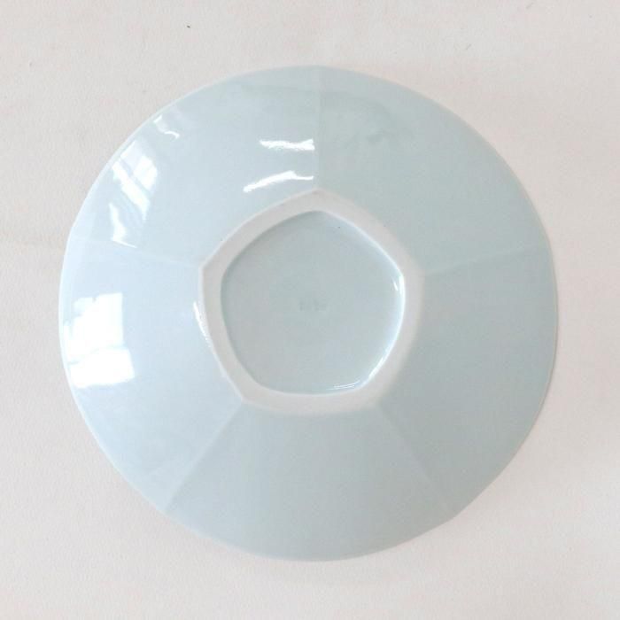 円形でなく、裏面からご覧いただくと分かり易いのですが五角形を緩やかに丸くした光沢のある青白磁の浅鉢の見込中心みから縁に向かって放射線状に長短の鎬(しのぎ)が入っています。