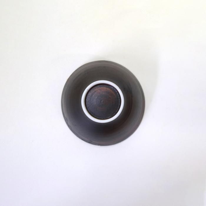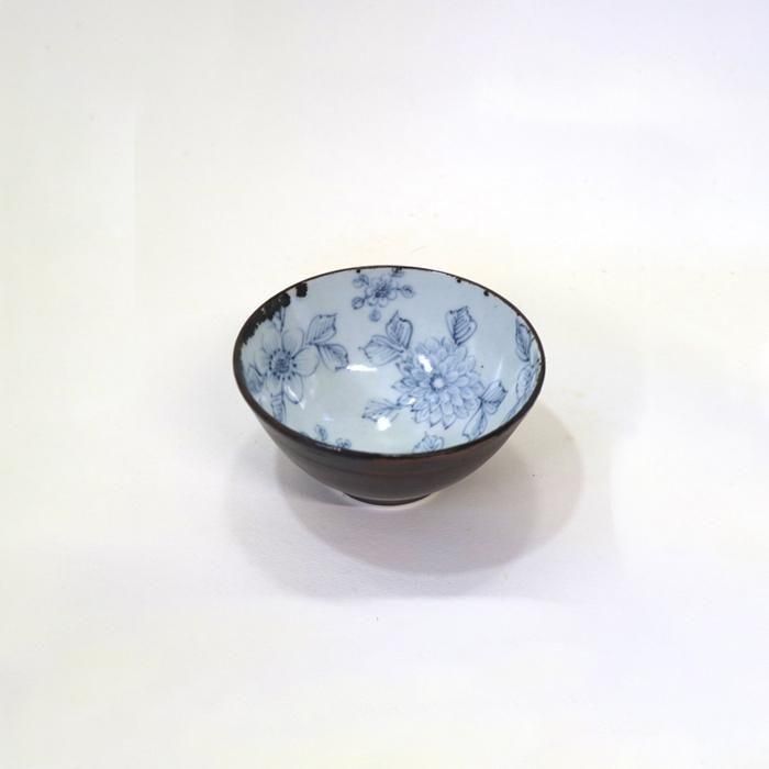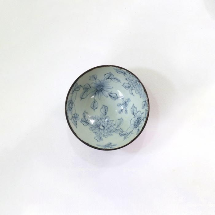 染付け花庭×黒小鉢は、裏面は艶消しの黒一色にして、表面は美しい白磁に淡い呉須で庭に咲く花々がしっとりと描かれています。