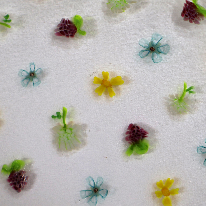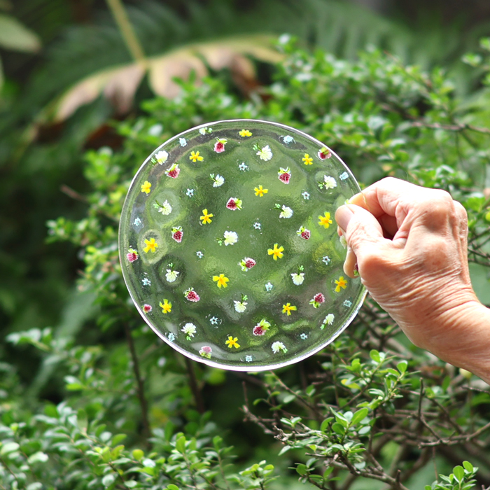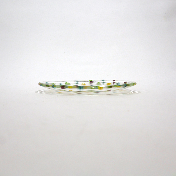 金太郎飴のような絵付けされた棒状のガラスをスライスしてグラス。プレート、ボウルに模様付けするムリーニ技法で作品を製作されています。竹下芽衣さんからプレート/野花が届きました。
