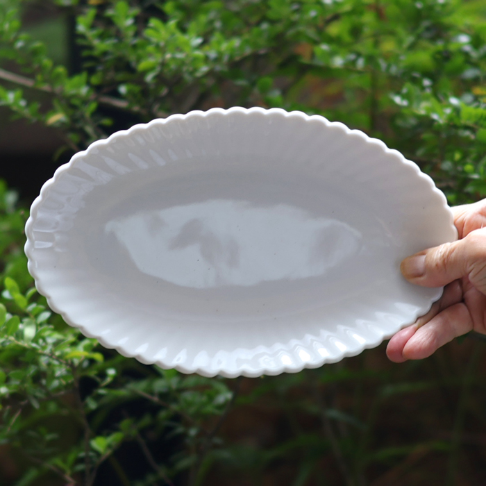 器は、”巨匠”村上雄一さんの「白磁輪花オーバルプレート」です。